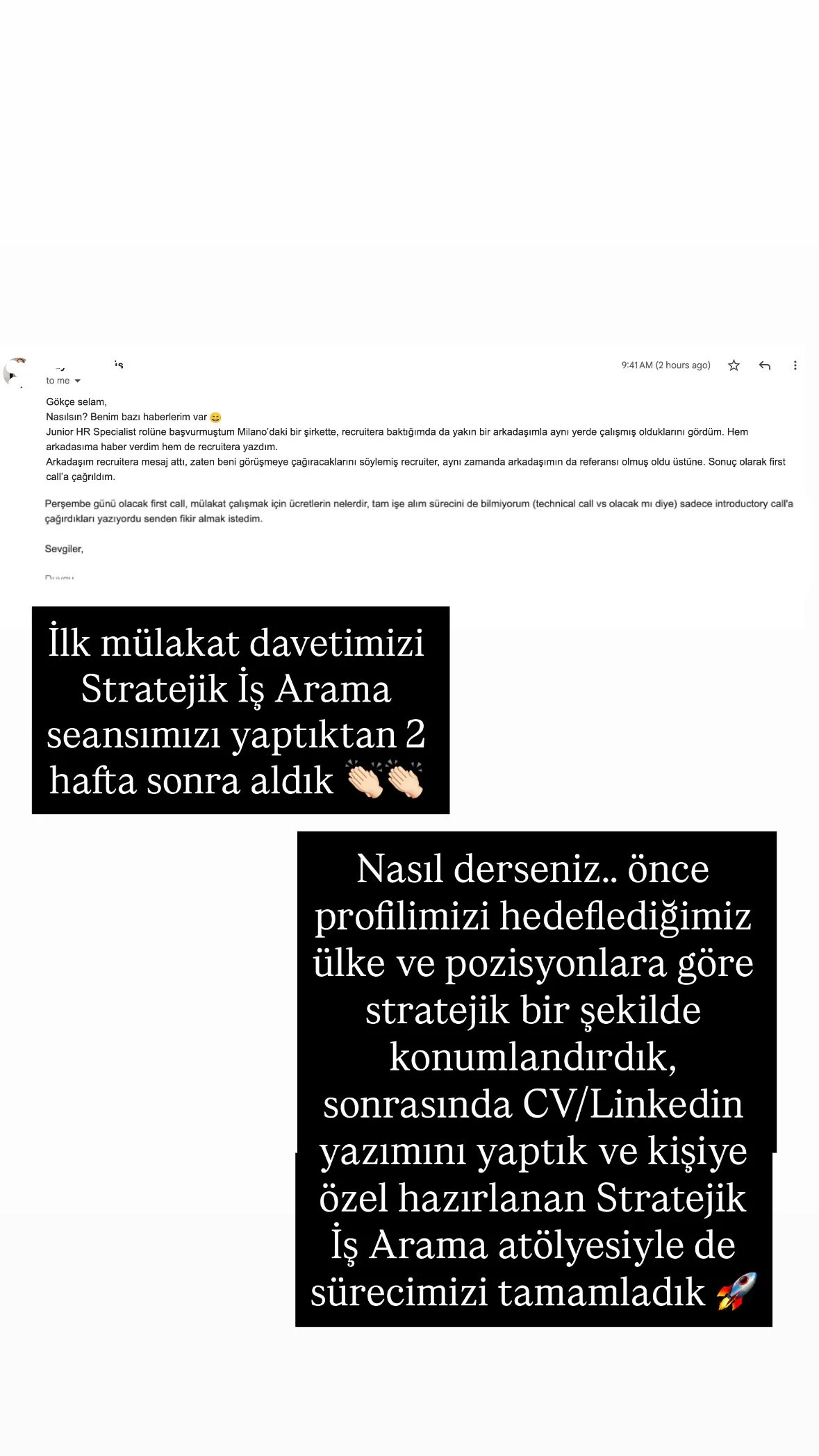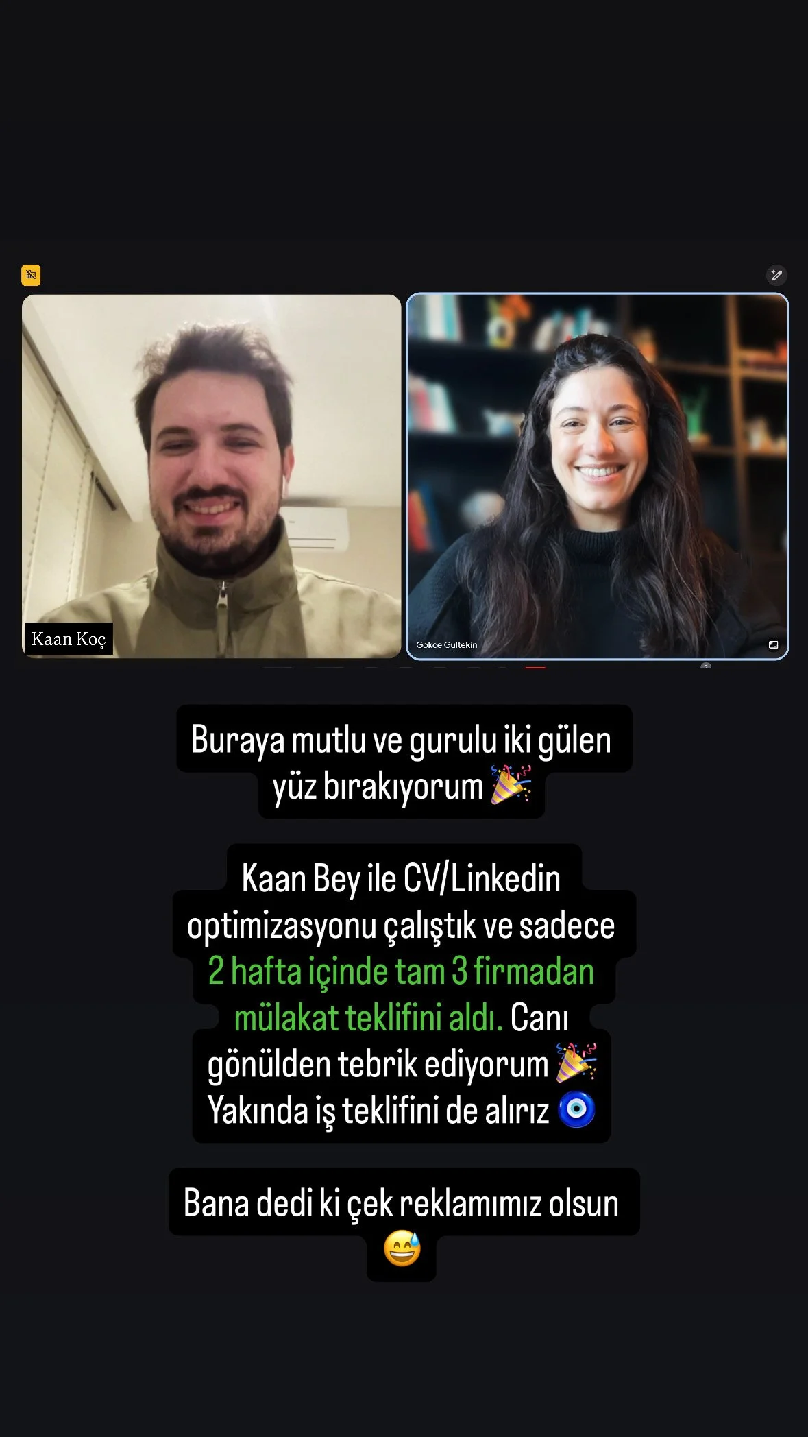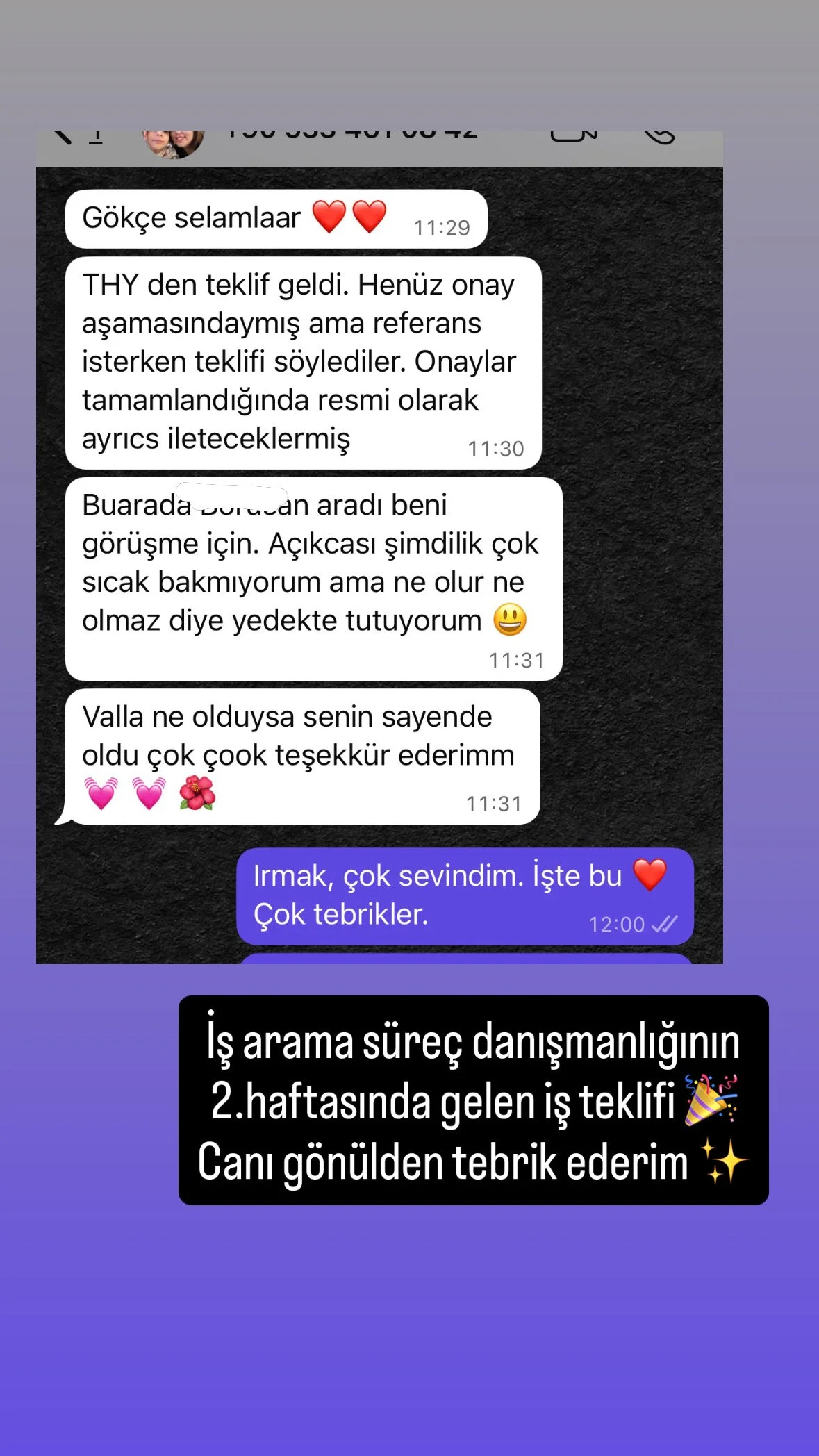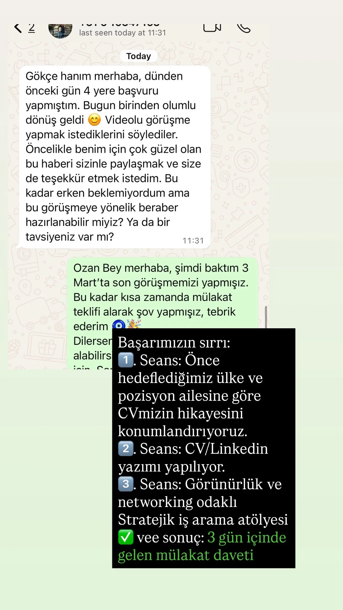 Onlarca başvuru yapıp geri dönüş alamamak hem yorucu hem de motivasyon kırıcı olabiliyor. 4 haftalık birebir program boyunca başvurularınızı birlikte takip ediyor, geri dönüşleri analiz ediyor ve stratejiyi haftalık olarak güncelliyoruz. Bu hizmeti tercih eden danışanlarımızın yaklaşık %65'i ilk ay içinde mülakat daveti alıyor.
